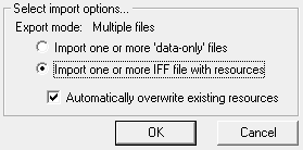 Press OK, type a name before the .iff part and press the OK button again. Now open up your newly cloned object from my door template with Iff Pencil. Click on the "Edit" Menu and select import. Use these options ...